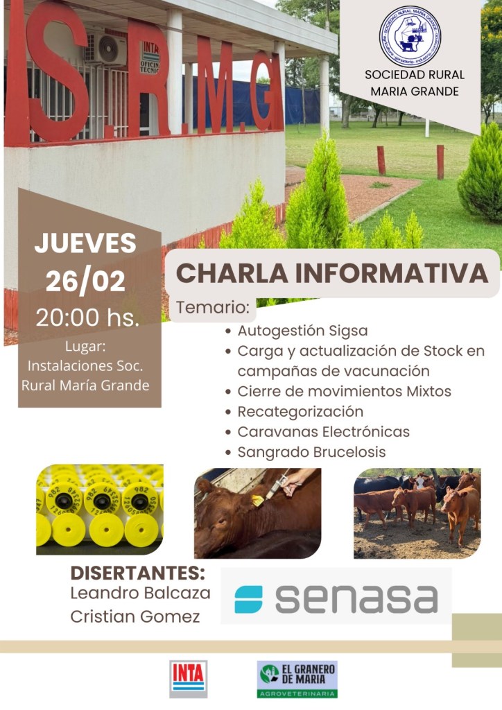 - Charla en Sociedad Rural María GrandeEl próximo jueves se realizará una charla con importantes temas que serán desarrollados por personal de… Lee más: Charla en Sociedad Rural María Grande